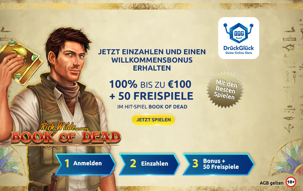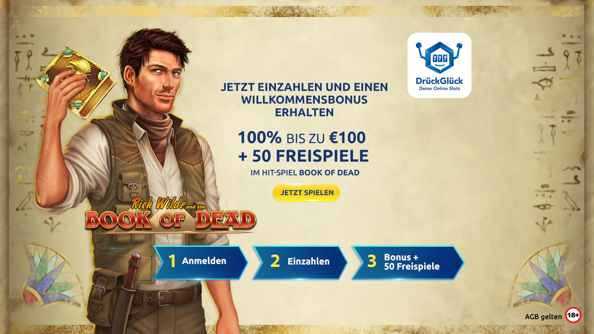 Nur die erste Einzahlung. Max. Bonus €100. Spiel: Book of Dead, Spielwert: €0.10. Einsatzanforderung: Innerhalb von 30 Tagen 30 Mal den Einzahlungs- und Bonusbetrag setzen (nur Spielautomaten zählen). Der maximale Einsatz sind 10 % (min. €0.10) des Bonusbetrags oder €5 (geringster Betrag gilt). D. Für Gratisspiele gelten die allgemeinen Nutzungsbedingungen. Einsatzanforderung: Innerhalb von 30 Tagen 60 Mal den Freispiel-Gewinnbetrag setzen (nur Spielautomaten zählen). Der maximale Einsatz sind 10 % (min. €0.10) des Freispiel-Gewinnbetrags oder €5 (geringster Betrag gilt). Die Spiele müssen verwendet bzw. der Bonus in Anspruch genommen werden, bevor das eingezahlte Guthaben genutzt wird. Einzahlungs-/ Willkommensboni dürfen nur einmal innerhalb von 72 Stunden bei allen Betreibern beansprucht werden. Regelwidriges Spiel kann zum Verlust des Bonus führen. Es gelten die standardmäßigen Bonusbedingungen.